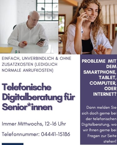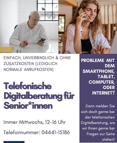 Viele Fragen zum Smartphone, Tablet, Computer oder dem Internet lassen sich am Telefon klären. Senior*innen können bei unserer Telefonhotline unter 04441-15186 anrufen.