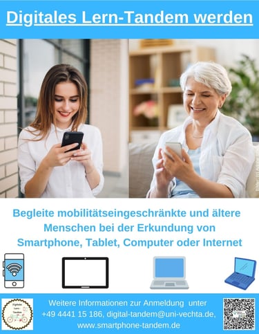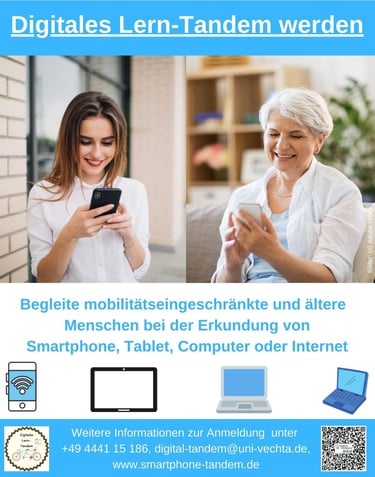 Studierende und Lehrende der Universität Vechta unterstützen ältere Bürger*innen bei Ihren Fragen rund um Smartphone, Tablet und Computer in gemütlicher Atmosphäre bei einer Tasse Kaffee im kleinen Kaufhaus in Steinfeld. Mitmachen kann jeder, egal ob Neueinsteiger*in oder Vorkenntnisse. An Gruppentischen wird Hilfe zu bestimmten Themen angeboten. Andere Studierende bieten individuelle Hilfe bei konkreten Problemen mit ihren Endgeräten.